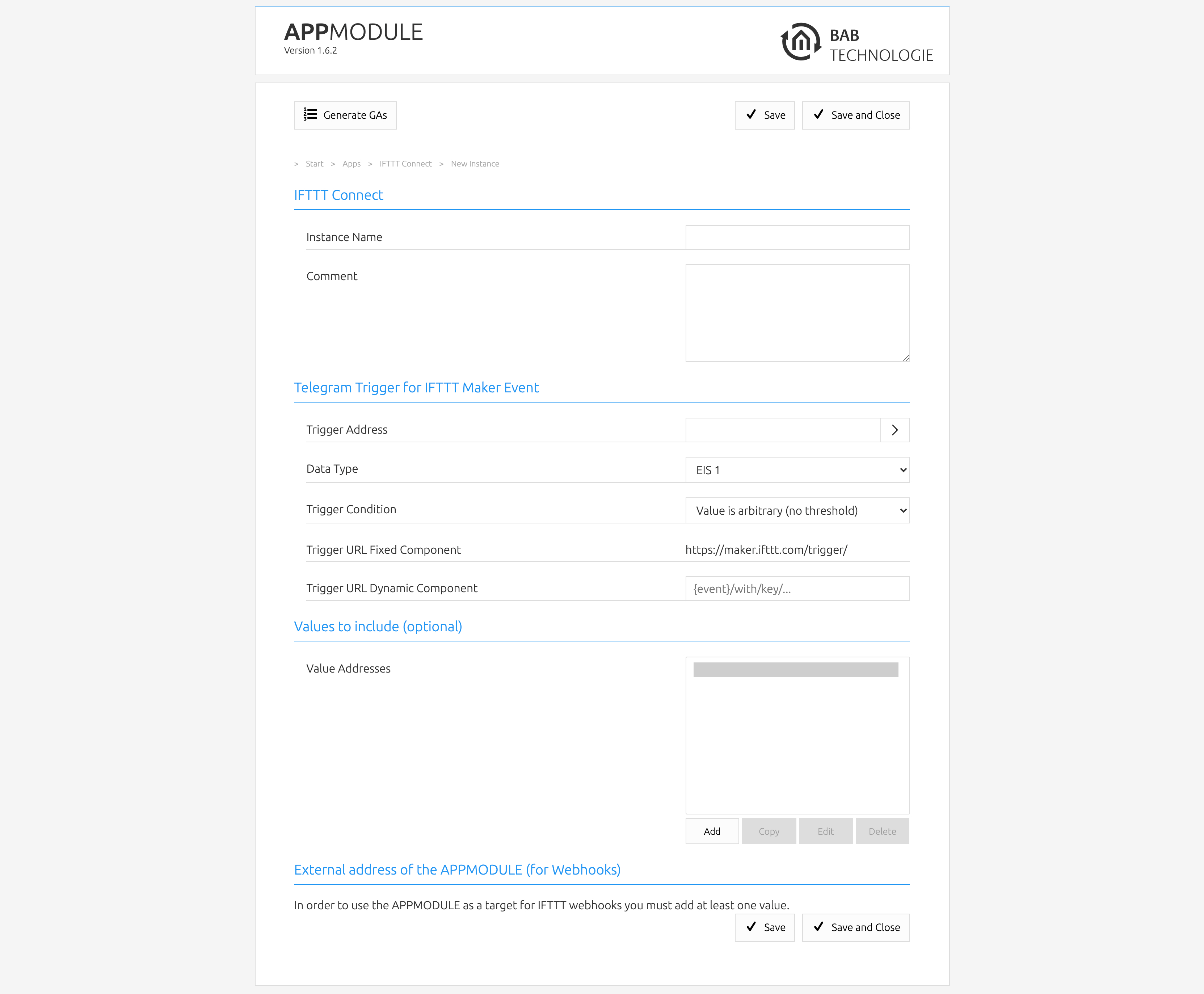With this app for the APPMODULE you connect over 600 IoT and web services with KNX or EnOcean. For example, transfer KNX counter readings to Google Tables or link your current geographical location to KNX scenes.
