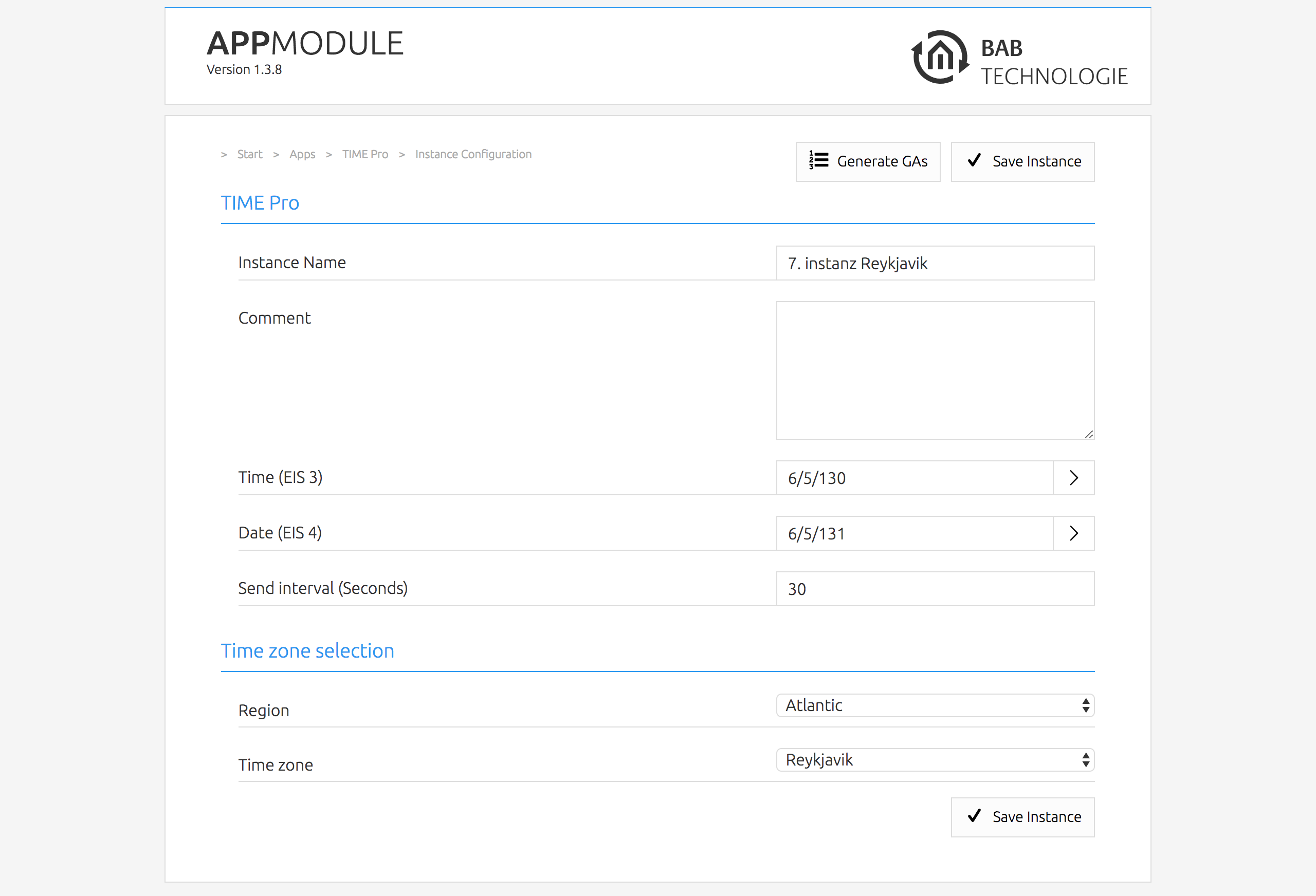 "TIME" sends an NTP server-based time signal including date and time to the KNX bus. Configure one time zone for remote properties or for visualisation.