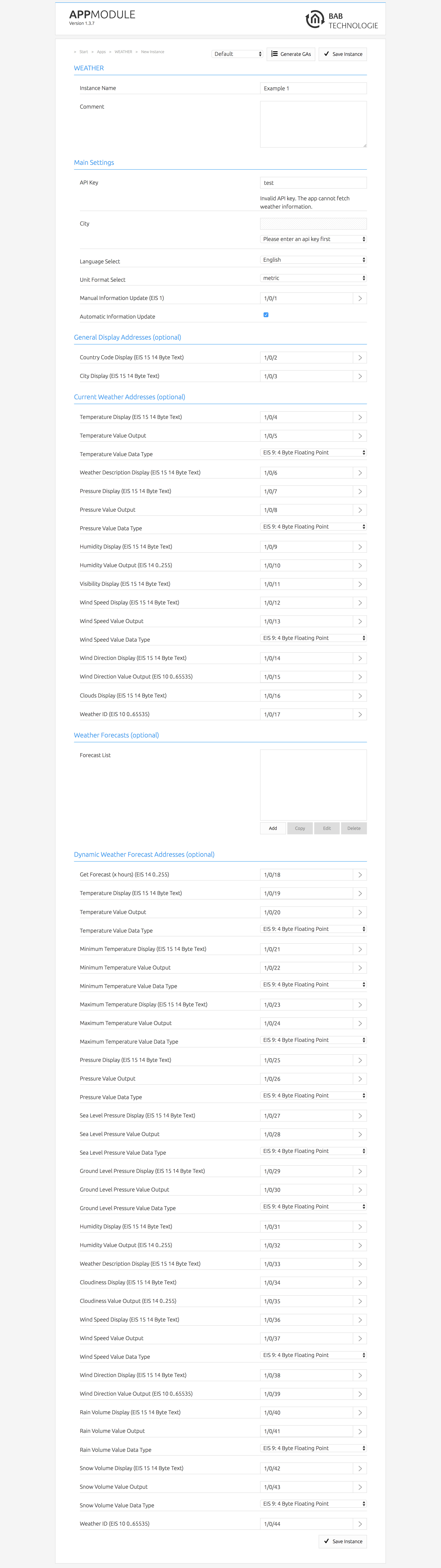 WEATHER connects your building control with data from OpenWeatherMap (openweathermap.org) in an intelligent manner. The data allows you to integrate the weather forecast into various algorithms. If, for example, a long dry period is forecast, the watering system can react appropriately and available sun protection systems can be brought into position. If a storm is forecast, the necessary protective measures can be taken automatically. OpenWeatherMap offers codes for a wide range of weather definitions – so-called "Weather condition codes". These codes simplify parameterisation of the system and allow for the clear classification of conditions. Of course current weather information can also easily be shown in the visualisation.