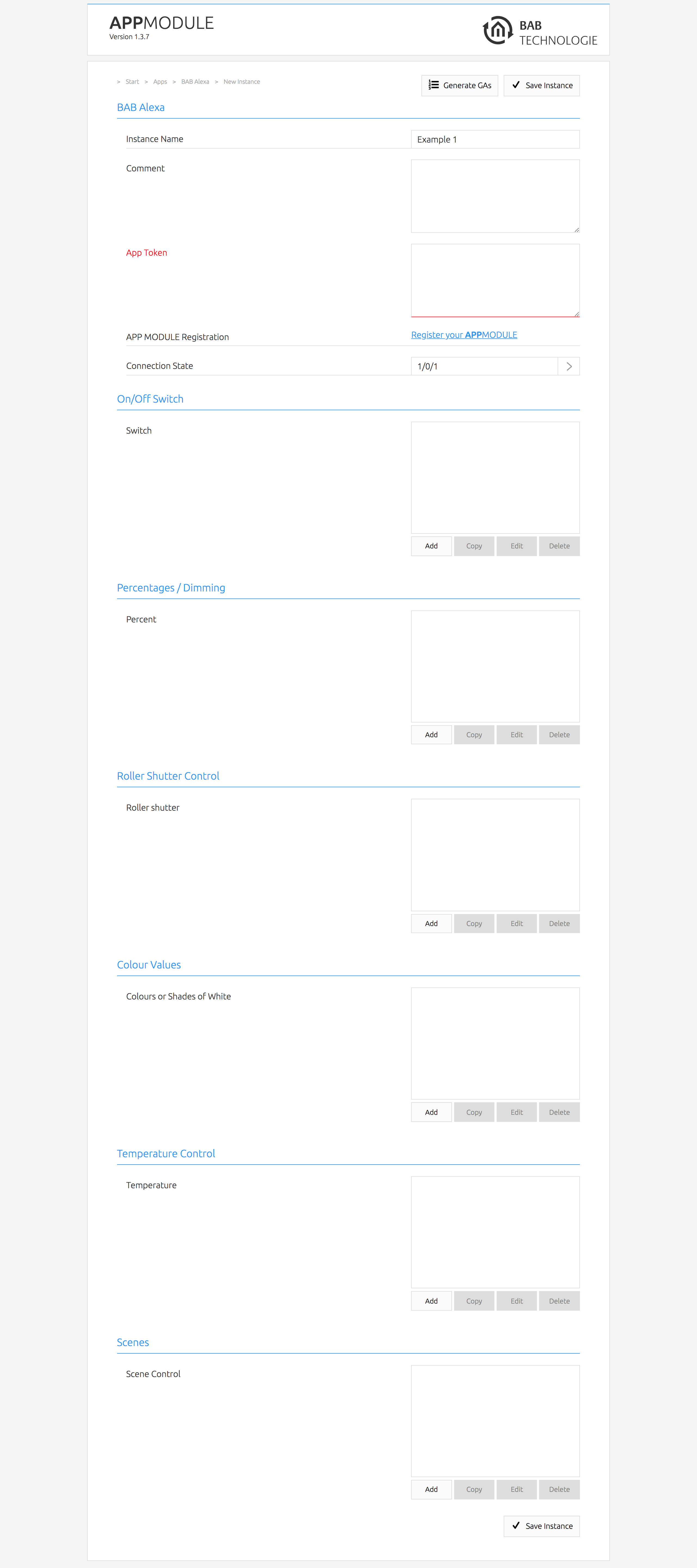 With this app you can integrate the Alexa voice control system from Amazon into your Smart Home based on KNX, EnOcean and IP. Control up to 100 elements per category with the standard version. In combination with the Alexa Skill "BAB TECHNOLOGIE" you can effortlessly connect your APPMODULE with Alexa. Connect the whole world of IoT and building automation with Amazon's voice control. Control any KNX, EnOcean or IP components by voice or start entire Smart Home scenes. Whether Denon HEOS, Bose SoundTouch, Pushbullet, Sonos or PJLink: All the apps you install on the APPMODULE can also be controlled with Alexa - regardless of whether this is supported by the manufacturer.