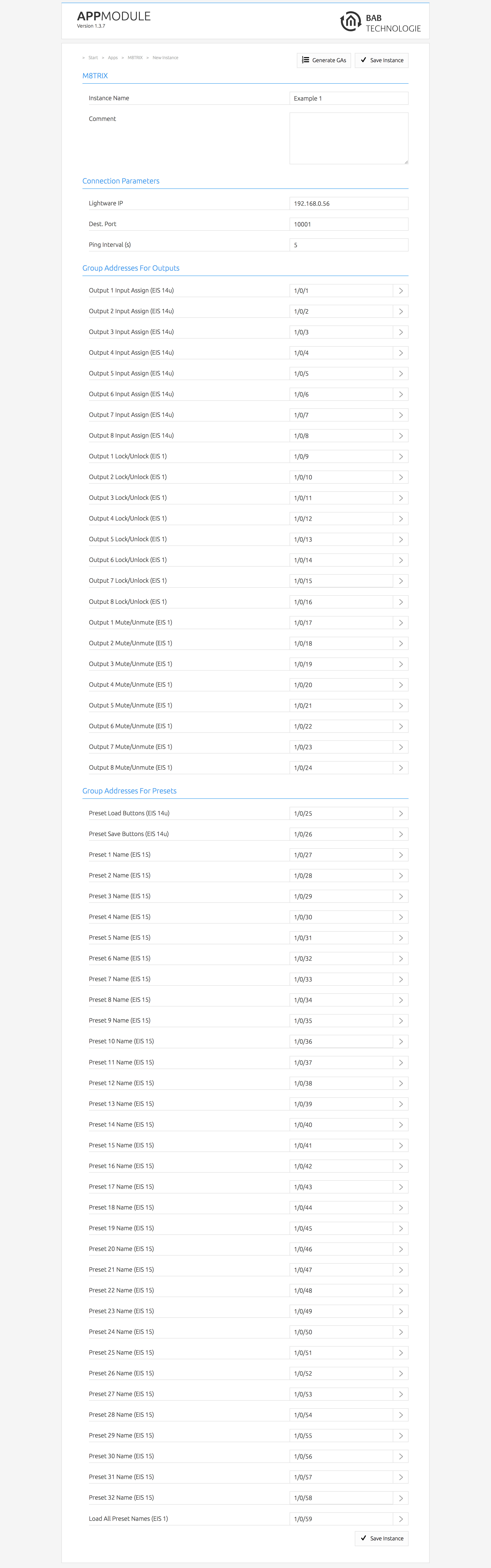 This App opens a TCP socket to a Lightware MX 8x8 DVI Pro and sends commands which are triggered by KNX® telegrams.